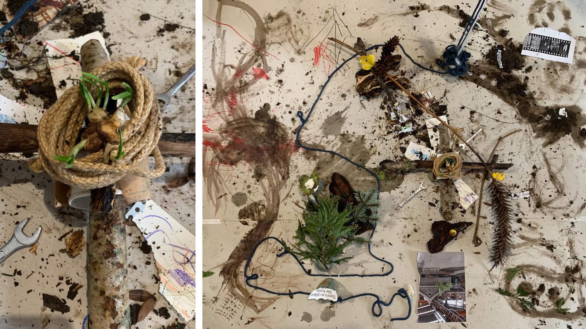 The workshop is a core activity in our Sensing the Bioregion practice, an iterative process to actively cultivate deeper understanding and awareness of self, other, place and time. We gathered back in the Art Room and shared our adventures over lunch, then simulated the experience of noticing using our phones to reinforce the concept of our different 'presents', each with its own potential (just like different possible futures). Then began an intense period of co-creating a "piece" using things we had collected, improvising, negotiating, seeing what was missing, like mud or colour, finding and adding it. We noted the sense of being done, of 'enough' and reflected on what we had made together - we owned the mess. The process had seemed to take only a few minutes. What followed, inexplicably, was a period of destruction, everything pushed to the middle, entangled. It felt like the only choice then was to regenerate. Structures appeared. "Islands of Coherence", someone said.